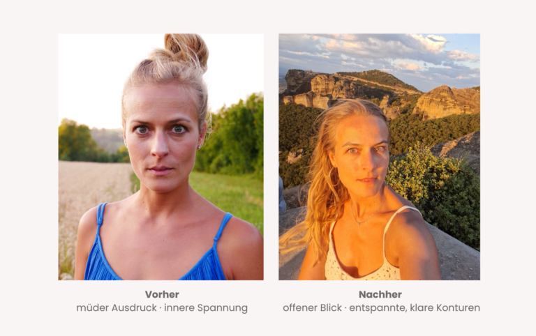 Erst durch Face Yoga sowie gezielte Faszien- und Lympharbeit veränderte sich mein Gesicht sichtbar: ein offenerer Blick, eine entspannte Stirn, klarere Konturen.